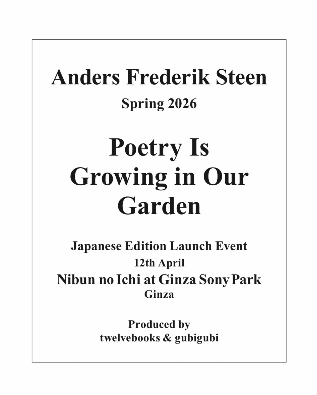 ション、さらに今回は、「Poetry Is Growing In Our Garden」日本語版の出版を記念し、当日はサイン本の販売を行うほか、SEEALLとのコラボレーションによるTシャツも限定数販売いたします。